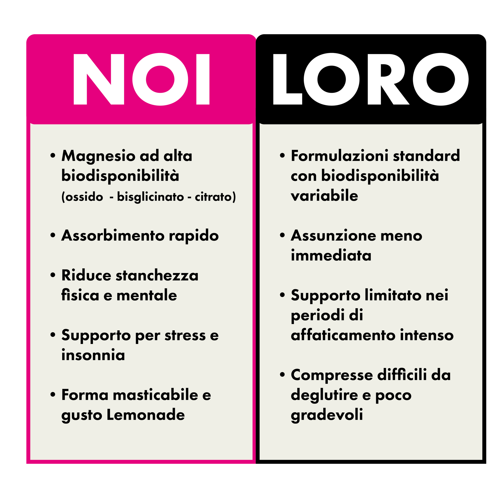 Molte persone non assumono sufficiente magnesio attraverso l’alimentazione, soprattutto in periodi di intenso stress, attività fisica elevata o regimi alimentari poco bilanciati. L’integrazione diventa quindi un valido alleato per sostenere i livelli ottimali di questo nutriente essenziale. MAGNESIUM Chewable fornisce un apporto pratico e immediato di magnesio, contribuendo a ridurre stanchezza e affaticamento, migliorare la concentrazione e favorire una migliore qualità del recupero fisico e mentale.